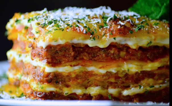 The dish is built by layering cooked pasta with a savory tomato-based meat sauce, often made with ground beef, garlic, onions, and herbs. Between the layers, creamy béchamel sauce or ricotta cheese adds richness, while mozzarella and Parmesan create a golden, bubbly top when baked.
