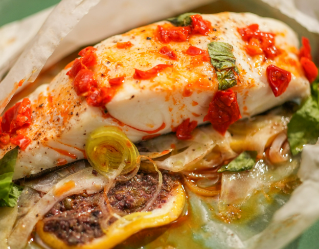 The fish is placed on parchment paper along with ingredients like lemon slices, garlic, herbs, and vegetables, then sealed and baked. As it cooks, steam builds inside the packet, allowing the fish to cook evenly while absorbing all the flavors. The result is a delicate, juicy dish with a fresh and natural taste.