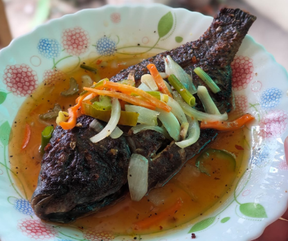 The fish is first seasoned and fried until golden and crispy, then coated with a colorful sauce made from onions, bell peppers, garlic, and vinegar. The sauce adds a bright, tangy flavor that complements the crispy texture of the fish. As it rests, the fish absorbs the sauce, becoming even more flavorful.