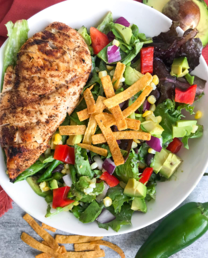 The chicken is marinated with spices and grilled until tender and slightly charred, giving it a rich and savory flavor. It is then sliced and served over a bed of fresh vegetables such as lettuce, tomatoes, corn, and peppers. The addition of lime juice or a light dressing enhances the freshness and adds a tangy twist to the salad.