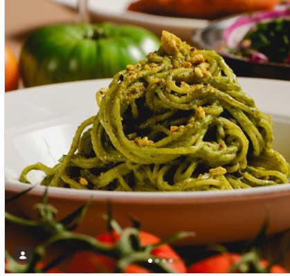 The pesto sauce is made from fresh basil leaves, garlic, olive oil, nuts (such as pine nuts), and Parmesan cheese, blended into a smooth and fragrant paste. When tossed with warm pasta, the sauce coats each piece, creating a light yet flavorful dish with a slightly nutty and cheesy taste.