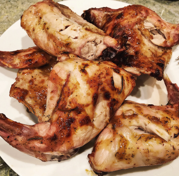 Rabbit meat is lean and mild, which allows it to absorb marinades and seasonings very well. When combined with ingredients like garlic, herbs, oil, and spices, the meat becomes flavorful and tender. Slow roasting ensures that the inside stays moist while the outside develops a golden, slightly crispy finish.