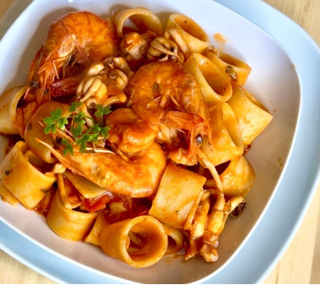 The pasta is cooked until tender and then tossed in a garlic-infused sauce made with olive oil, butter, or cream. Fresh seafood is gently cooked to keep it tender and juicy, while herbs and spices enhance the overall flavor. The result is a perfectly balanced dish with a mix of creamy, garlicky, and slightly tangy notes.