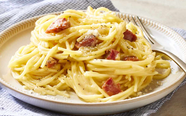 The spaghetti is cooked until tender and then tossed with a mixture of eggs and grated cheese, which forms a smooth sauce when combined with the heat of the pasta. Crispy pancetta or bacon adds a savory, salty flavor, while black pepper gives it a subtle kick. The result is a perfectly balanced dish that is creamy, flavorful, and satisfying.