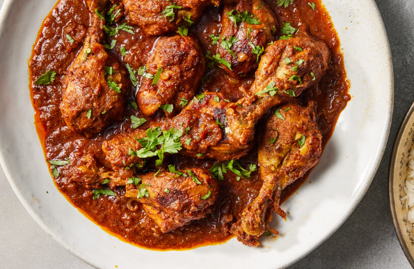 The curry base is prepared using onions, tomatoes, garlic, and ginger, combined with a blend of spices that create a deep and intense flavor. The spices give the dish its signature heat and aroma.