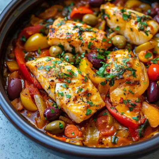 The fish is gently simmered with ingredients like tomatoes, onions, garlic, and spices such as cumin, paprika, and turmeric. Lemon, olives, and fresh herbs add brightness and depth, creating a well-balanced and aromatic dish. The slow cooking process allows the fish to absorb all the flavors while remaining soft and flaky.